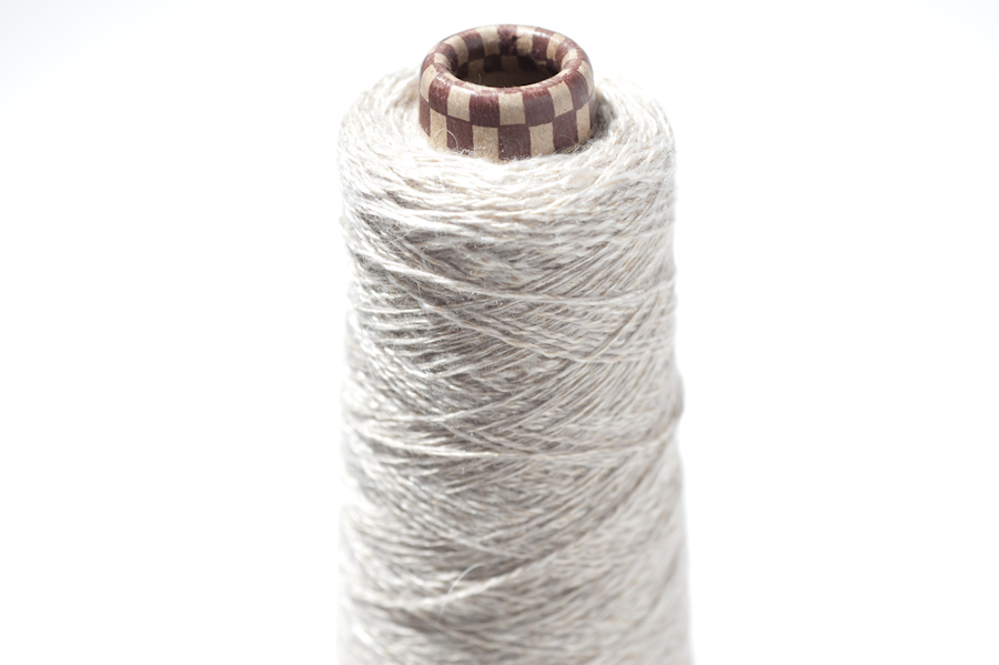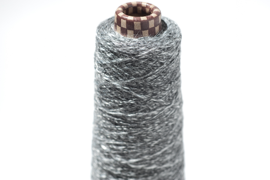 ラムウールとアンゴラの混紡糸とシャイニースラブを撚り合せました。